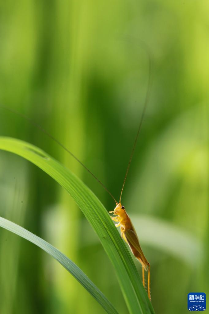 4月30日,昆虫在云南省西双版纳傣族自治州景洪市澜沧江湿地的草丛中舞动触须。新华网