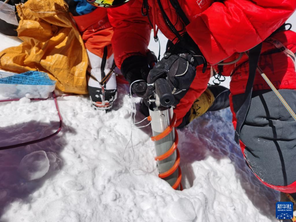 5月4日,在珠穆朗玛峰峰顶,科考队员正在采集冰雪样品。新华网