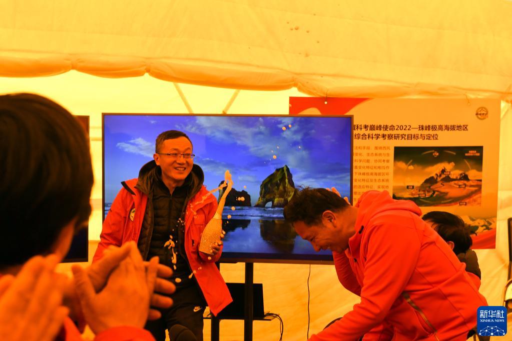 5月4日,在珠峰脚下海拔5200米的总指挥会议室帐篷里,大家热烈庆祝“巅峰使命”珠峰科考登顶观测采样成功。新华网