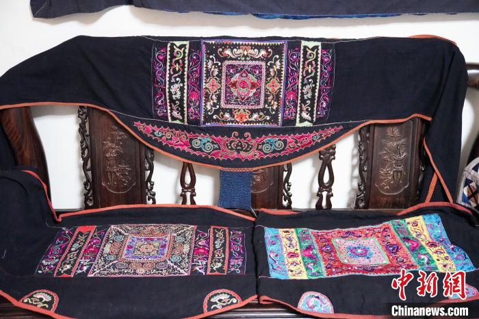 黄碧瑜出生在广西百色隆林各族自治县一个壮族小村庄,从小跟随长辈和当地民间艺人学习纺纱、染线、织布等传统纺织技艺,并熟练掌握了壮族背带制作方法。2019年被评为自治区非物质文化遗产“隆林壮族背带”代表性传承人。为收集与丰富形式和纹样,黄碧瑜长期在农村中收购刺绣背带。她制作的背带多次受邀参加国内外的大型文化艺术展览,多件作品被国内外博物馆收藏。图为黄碧瑜从各处收集购买来的背带。