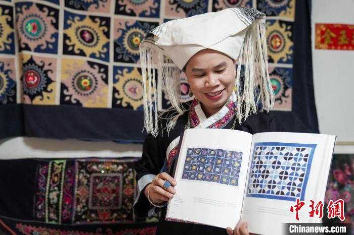 壮族背带制作耗时长、技艺复杂,制作一件背带往往需要数月之久,愿意学习这项技艺的年轻人越来越少,黄碧瑜闲暇之时大力推广壮族背带和壮族拼布技艺,在中小学开展“非遗进校园”活动,无偿为在校师生进行培训外,并主动寻找机会,将自己的作品在咖啡厅展演、与摇滚乐团合作提供演出服饰,还曾前往美国参加刺绣展览,每逢“壮族三月三”或其他重大节点,都会接受邀请到广西民族博物馆向观众进行现场展演。图为黄碧瑜的作品被多家博物馆收藏,多本国内外出版物收录。