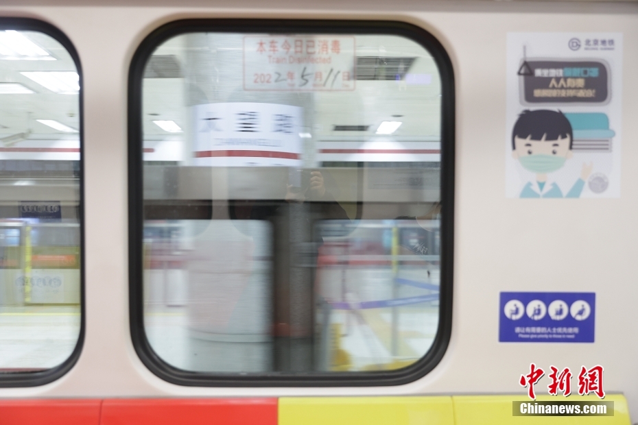 近日,北京市根据疫情防控需要,对北京地铁80余站出入口采取封闭措施,地铁交通网内载乘秩序井然。 图为5月11日,一列地铁列车低速驶过北京朝阳区一地铁站。中新网