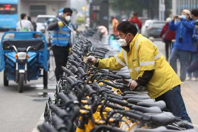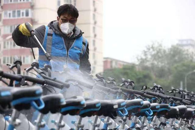 五一假期后,受多地地铁站、公交站封控影响,单车骑行量上涨明显。哈啰后台数据显示,5月5日至9日,城六区哈啰单车每日骑行量相比5月4日平均增加4.7%。美团单车数据显示,5月5日6点至7点北京地区骑行量同比上周增长21.9%。面对突如起来的骑行需求,三家共享单车企业想尽办法加大车辆投入。并且设立专门负责各个网格车辆的消杀工作组,在每个网格运维消杀的基础上,加大运营区域车辆的消杀力度,增加“双保险”,消杀工作从每天3次,增加到每天6次。图为近期,运维人员对地铁站外共享单车进行消杀。北京青年报