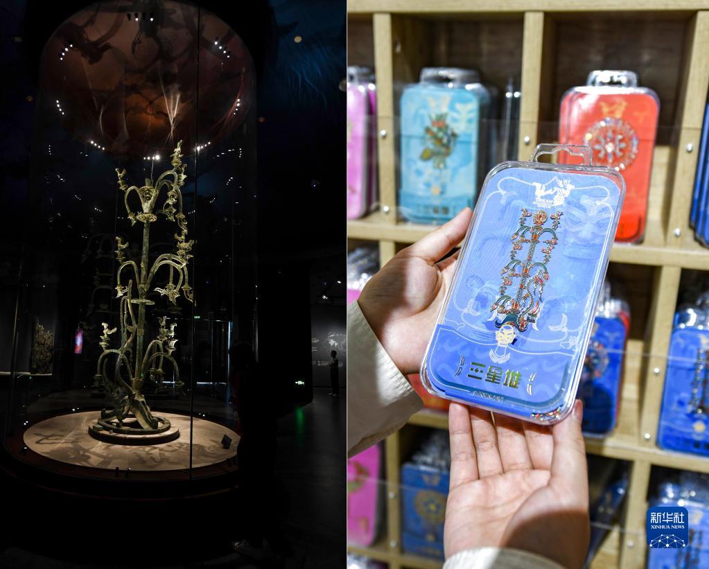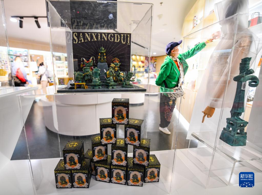如今,中国越来越多的博物馆依托别出心裁的“跨界”文创吸引大众,不仅激发了更多人探索的兴趣,也给优秀的历史文化注入活力。5月18日“国际博物馆日”,让我们来感受博物馆的力量。近年,三星堆遗址重要考古发现成果陆续公布,带动三星堆博物馆的文创产品设计销售热潮,一些文创产品取材于发掘出土的金面罩、青铜器等文物,受到人们的欢迎。图为5月16日在三星堆博物馆文创商店拍摄的盲盒系列产品。新华网