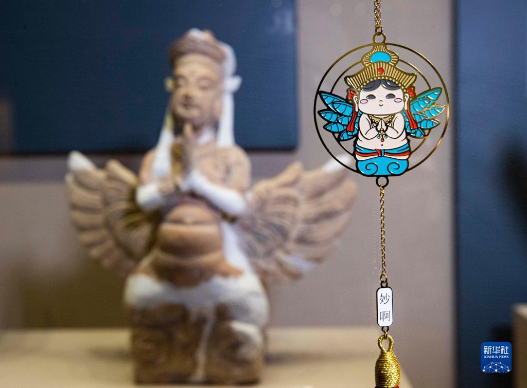 5月16日拍摄的宁夏博物馆的文创产品“妙娃”车载挂件(前)与馆藏红陶迦陵频伽。“妙娃”形象,融合了“妙音鸟”的形象故事和敦煌壁画,并结合宁夏当地方言取名“妙娃”。它的文物原型为“迦陵频伽”。新华网
