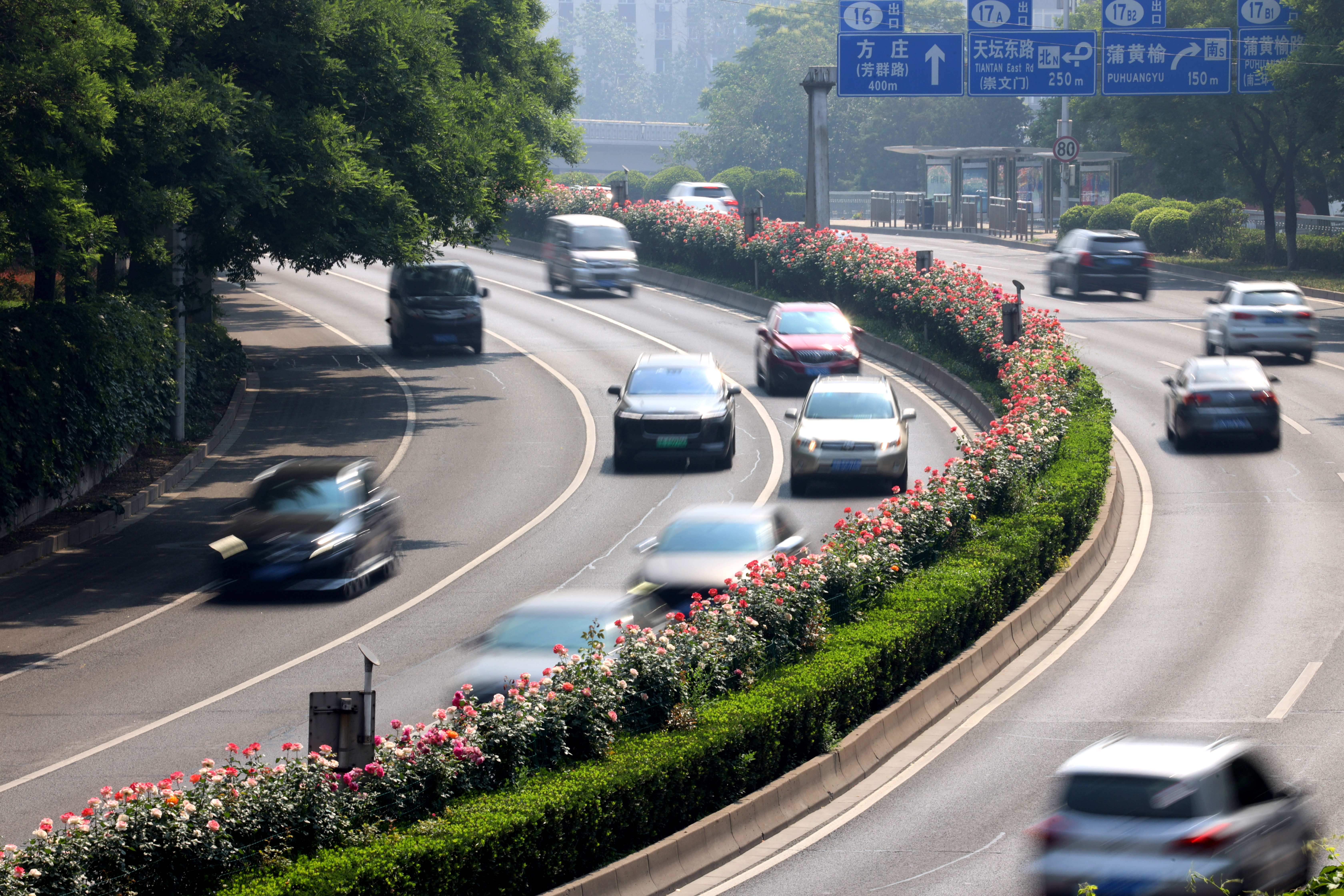 2022年5月20日,北京二环路车水马龙,五颜六色的月季花悄然绽放。 南美侨报特约记者 卞程宣 摄