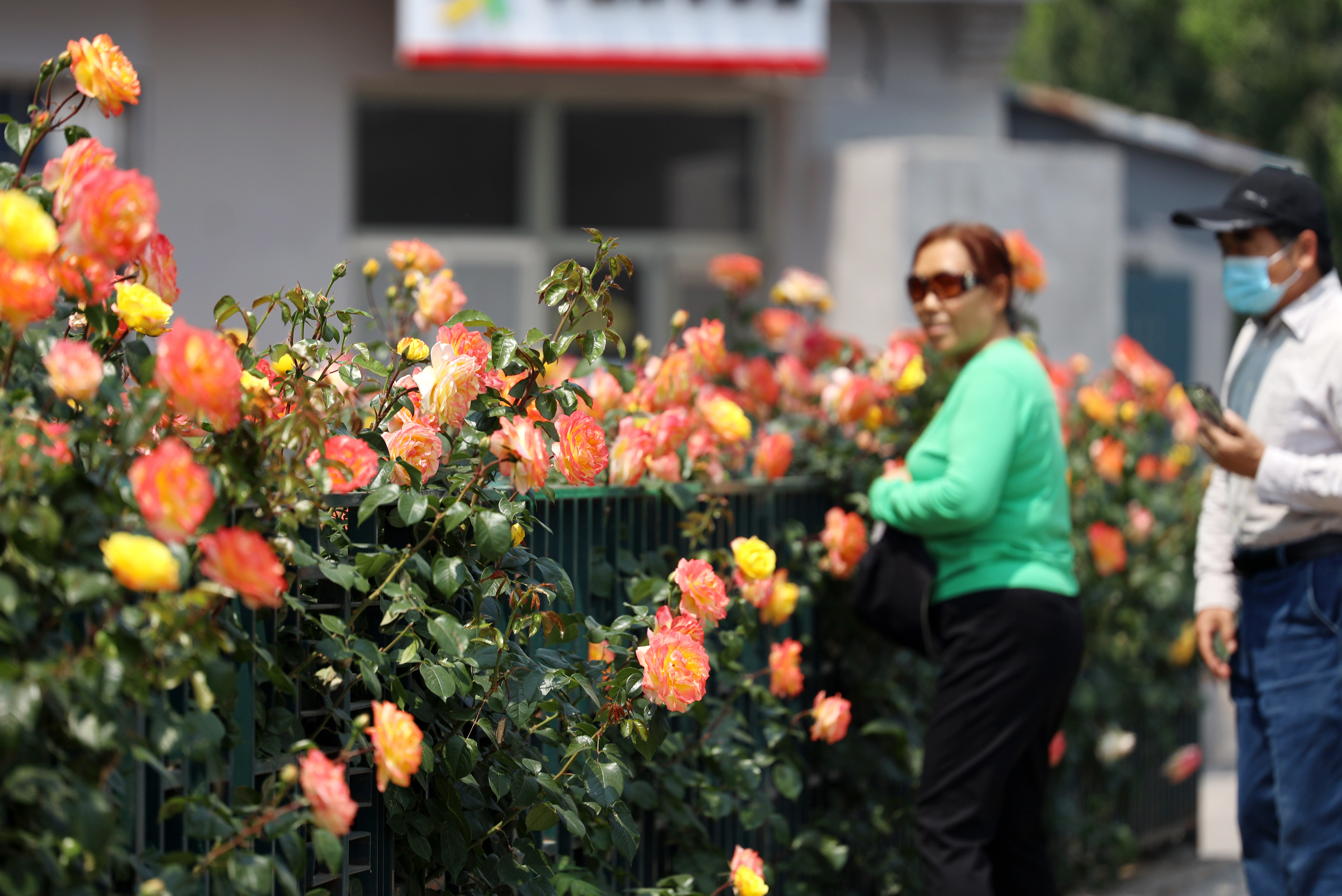 2022年5月20日,北京街头月季花盛开,吸引市民参观留影。 南美侨报特约记者 卞程宣 摄