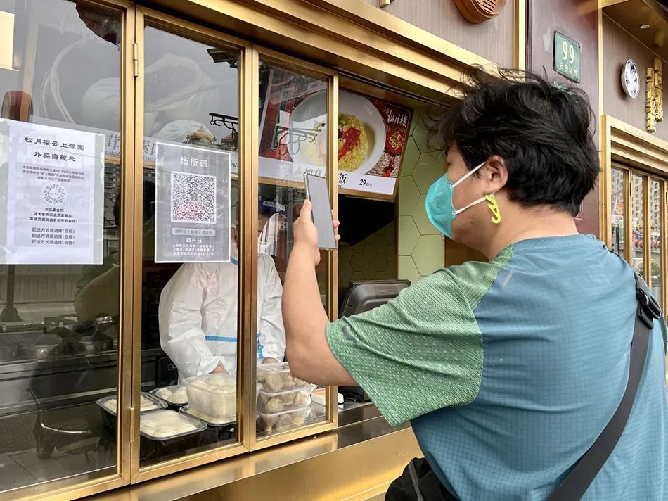 图为5月28日,市民在豫园商城内一店铺扫场所码。澎湃新闻