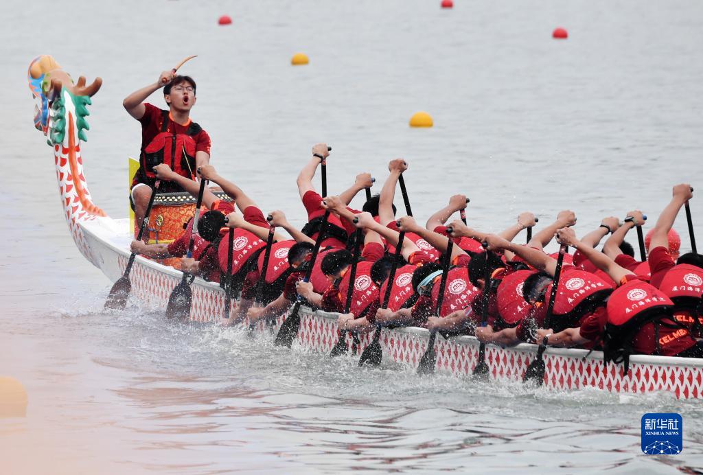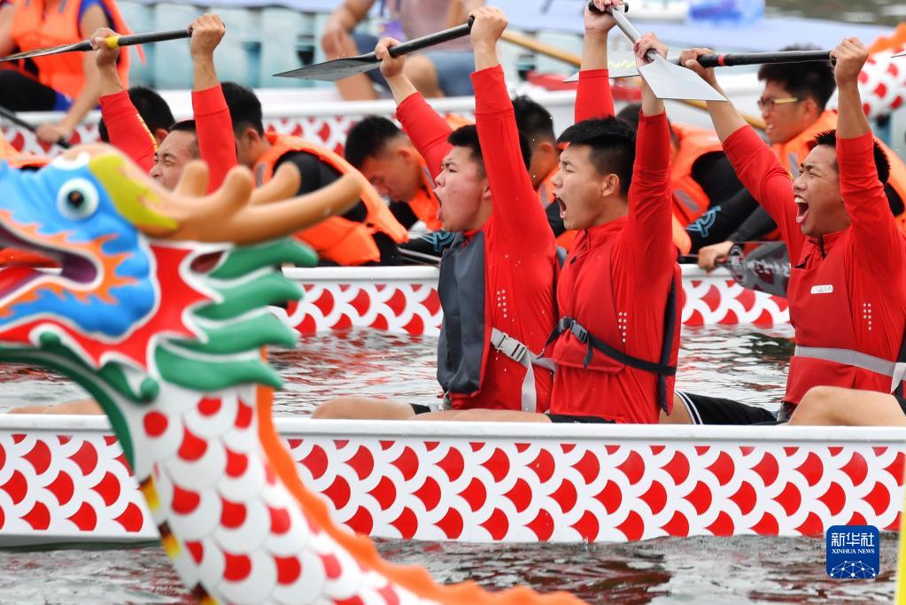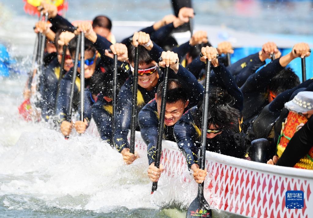 6月2日,在“龙腾虎跃”2022海峡两岸赛龙舟活动现场,来自厦门海洋学院的龙舟队队员在比赛中奋力划桨。新华网