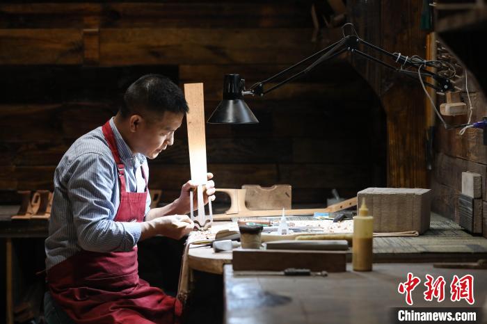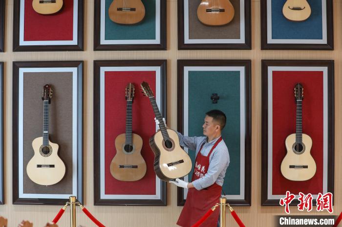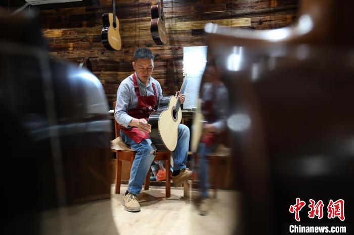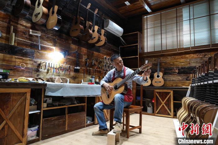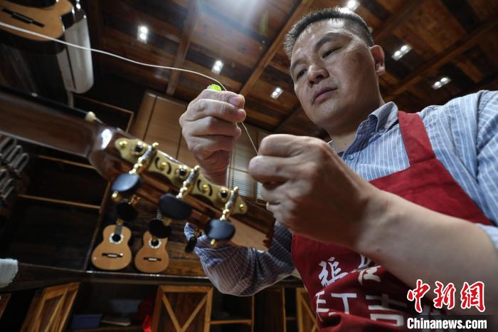 贵州省遵义市正安县被誉为“中国吉他之都”,从2013年开始发展吉他产业,目前该县的吉他除工厂批量生产外,还有一部分来自于手工制作。44岁的张维义是正安县的吉他制作大师,自2002年从事吉他制作以来,他一直潜心研究,主攻古典吉他制作,至今已有20年。吉他手工制作需要三个月,经过白胚制作、法式抛光漆、装配等大小工序180多道,耗时并且复杂。张维义说,“手工制作虽然不易,但我希望做好每一把吉他,让使用它的演奏者感受到演奏的乐趣。”图为6月4日,张维义在查看制作完成的吉他。