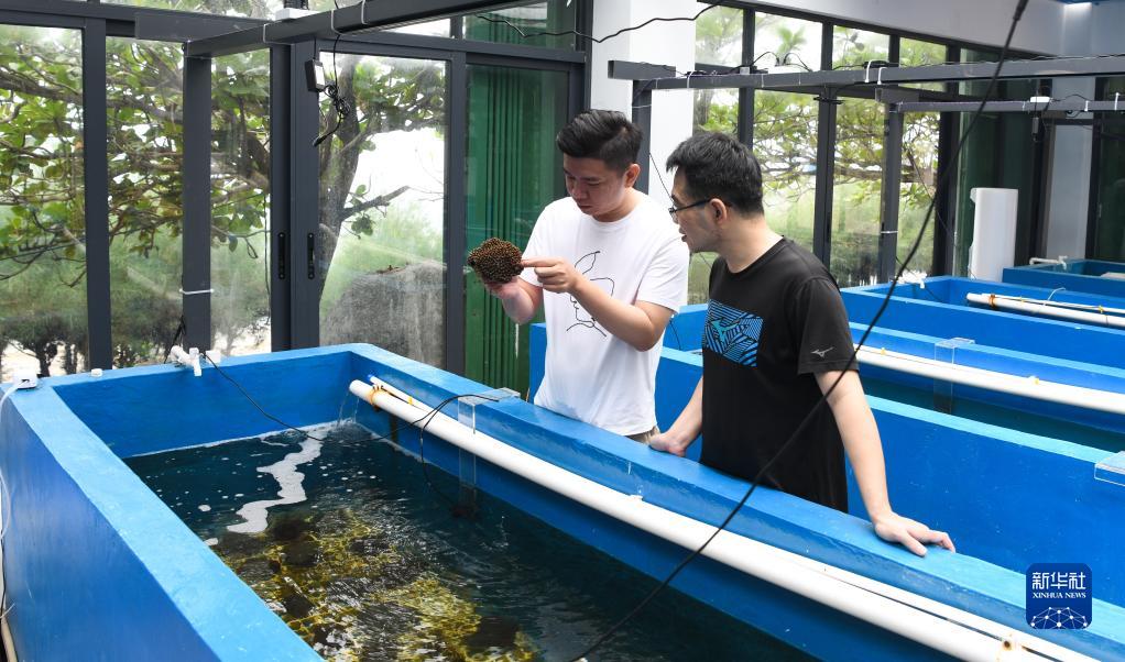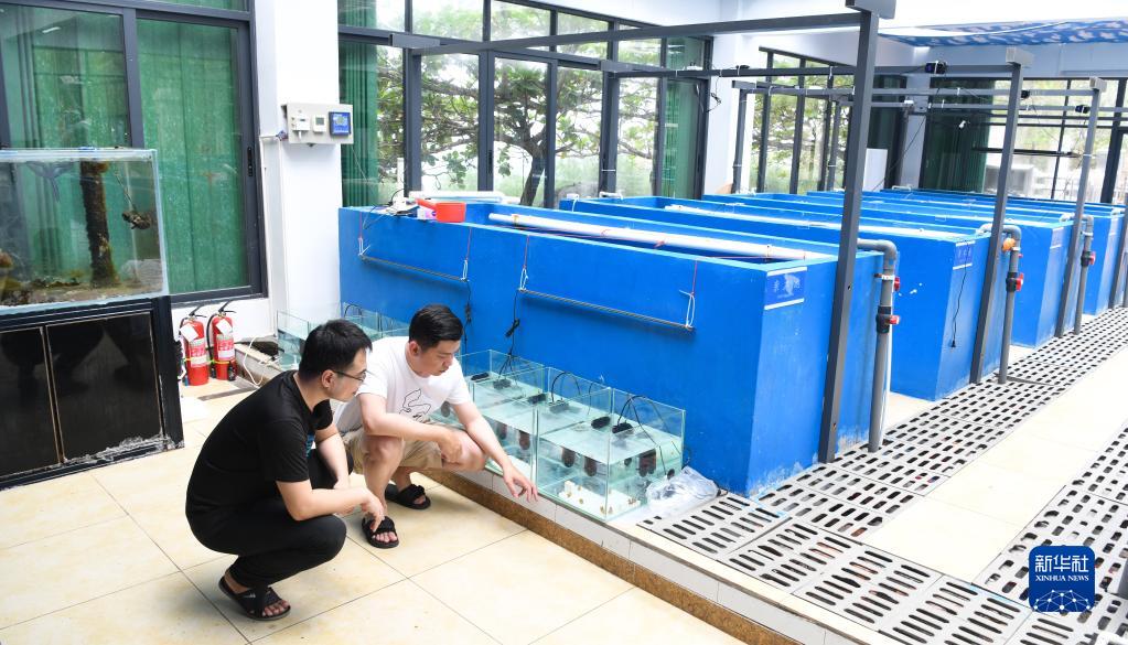今年32岁的吴川良于2017年发起创立了三亚珊瑚礁生态研究所,目前担任该研究所负责人。研究所成立5年,科研团队已有14人,包含珊瑚分类鉴定、珊瑚礁生态修复、海洋工程等各种专业人员,大部分为“90后”。他们主要从事珊瑚的繁育、移植,生态修复和生态环境的监测、调查等工作。图为5月12日,在位于海南省三亚市西岛的三亚珊瑚礁生态研究所科研基地,吴川良(左)与同事在查看珊瑚生长情况。新华网