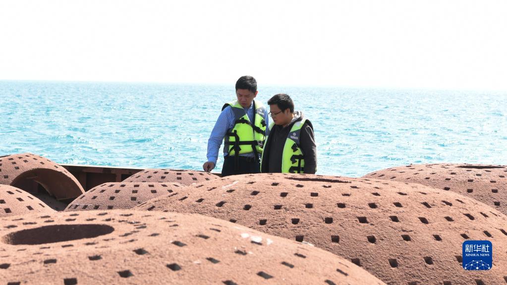 1月18日,在中国海南省三亚市亚龙湾海域,吴川良(左)和同事在运输船上检查即将投入海中的人工生态礁。新华网