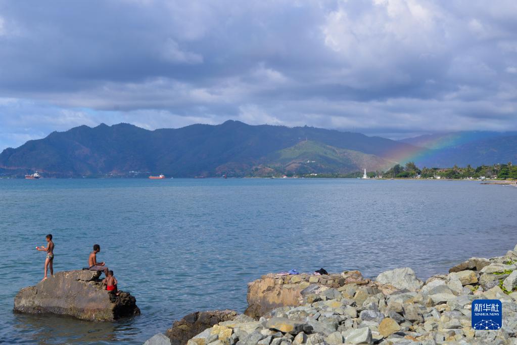 6月6日,在东帝汶首都帝力,一道彩虹出现在海边(无人机照片)。新华网