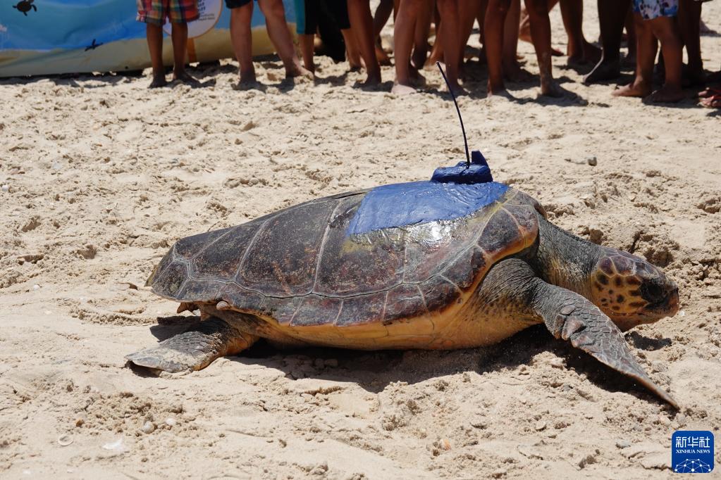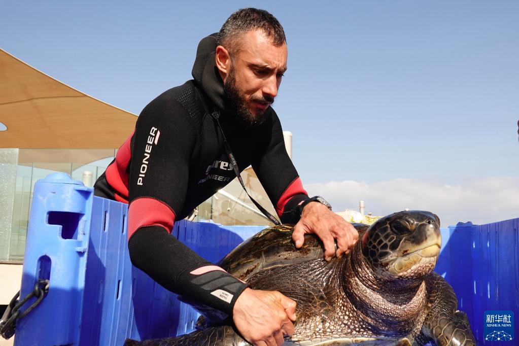 6月6日,在位于以色列北部城市哈代拉附近的一处海滩,一只经过以色列自然与公园管理局海龟救援中心救治伤愈的海龟被放归大海。新华网