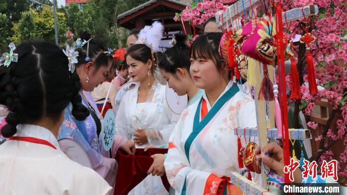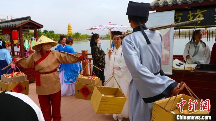 6月16日,新疆库车市东湖公园“千人古装秀”吸引了疆内外众多游客前来观看。不同年龄段的群众身着各种风格的古装服饰在东湖边,开起千人古装走秀。据了解,该活动是新疆库车市首届龟兹文化艺术节系列活动之一。图为身穿古装扮演挑担货郎叫卖自家特产。