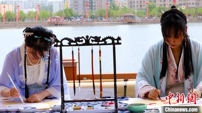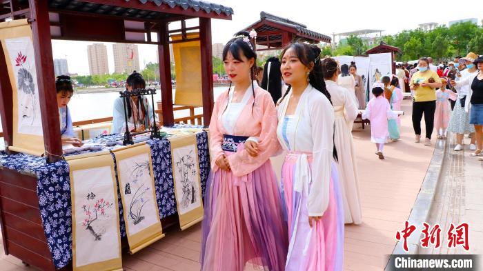 库车市不同年龄群众身着各种风格的古装在东湖边开起千人古装走秀。