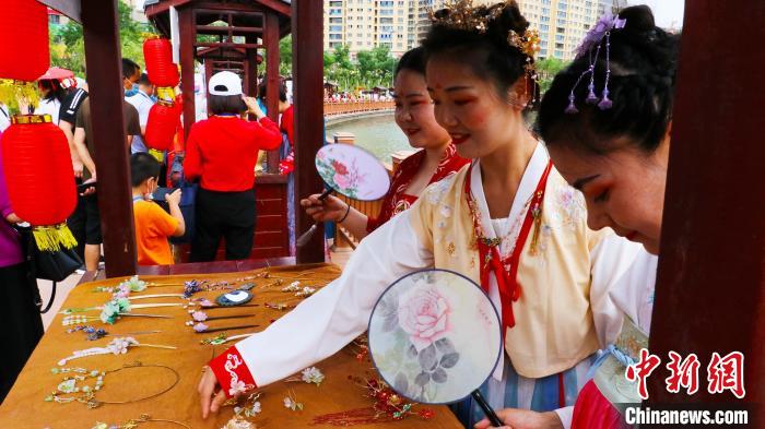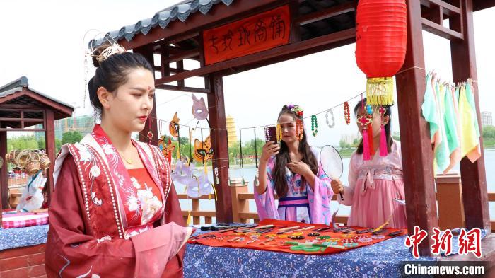 库车市东湖边香囊柜台吸引诸多女子围观。