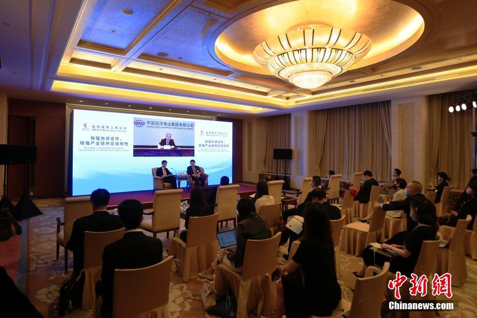6月22日,2022年金砖国家工商论坛举行“加强协调合作,增强产业链供应链韧性”专题研讨。图为中国远洋海运集团有限公司董事长万敏视频发言。中新网