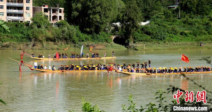 6月22日,苗族独木龙舟节上,奋勇争先的龙舟。中新网