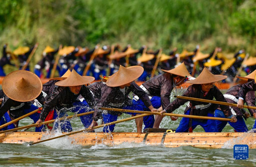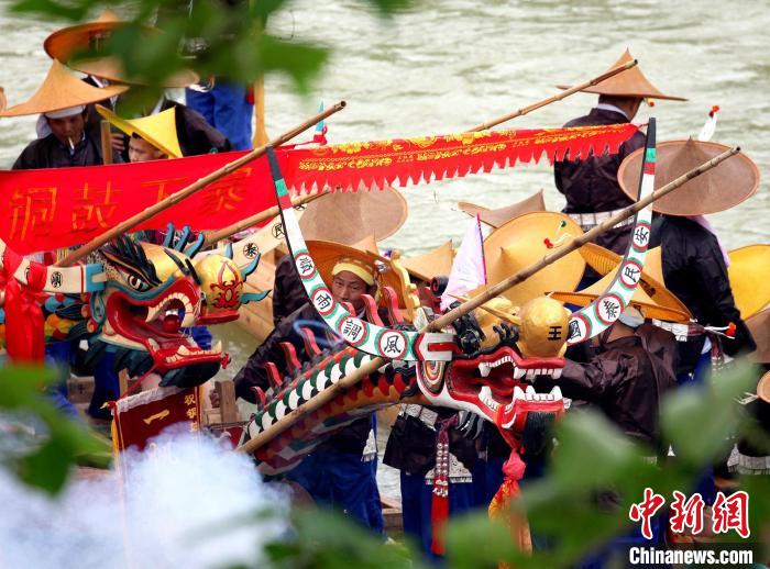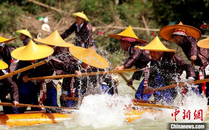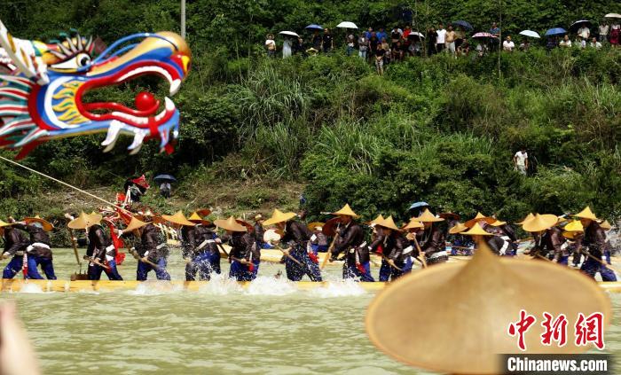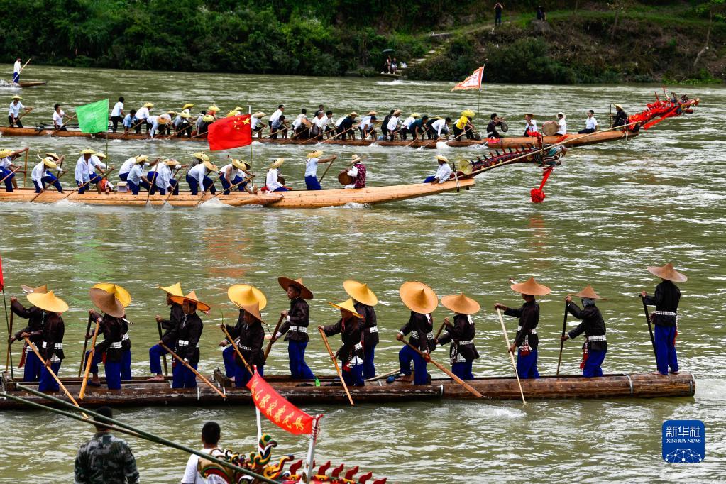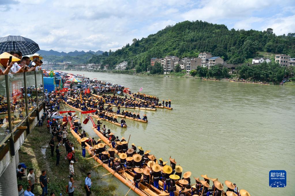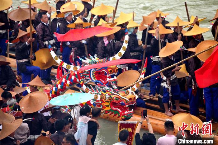 6月23日,苗族民众在贵州省台江县施洞镇清水江上赛独木龙舟。新华网