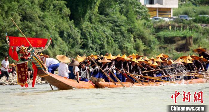 6月22日,苗族独木龙舟节上,一条奋力向前的龙舟。中新网