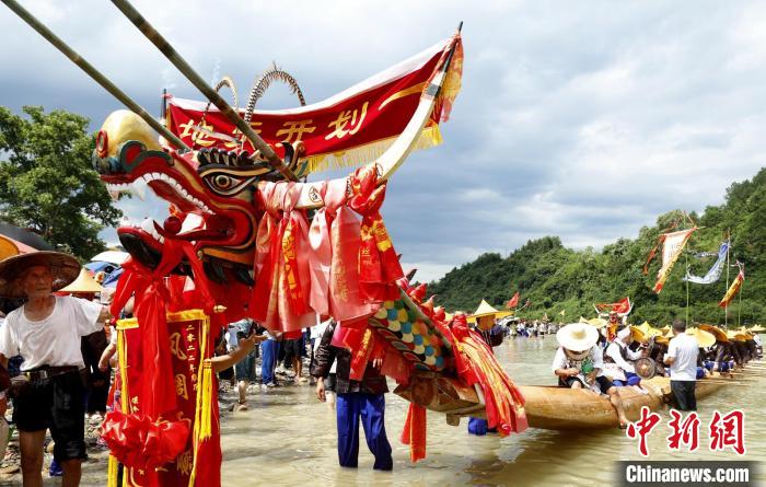 6月22日,苗族独木龙舟节上,一条挂满“祝福”的龙舟。中新网