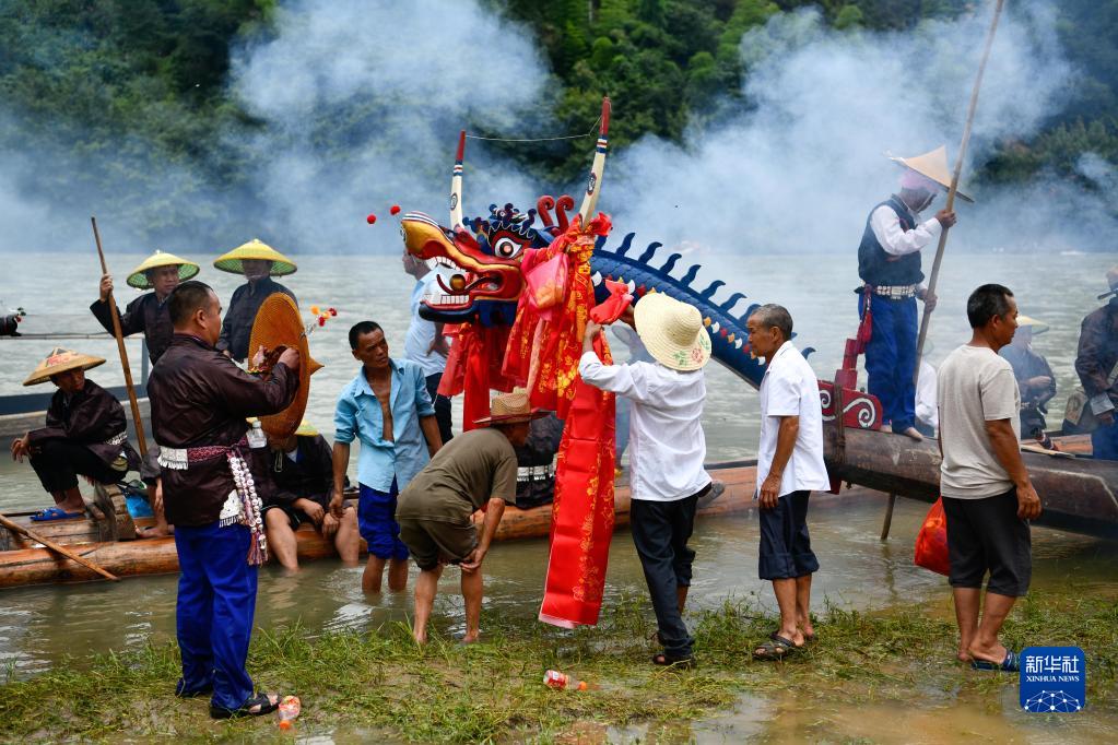 6月23日,人们给参赛的独木龙舟挂红绸。新华网