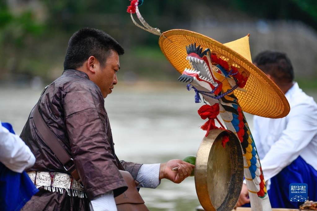 6月23日,施洞镇清水江上赛独木龙舟时鸣锣。新华网