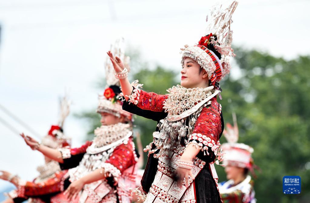 6月23日,在贵州省台江县施洞苗族独木龙舟节开幕式上,苗族姑娘表演民族舞蹈。新华网