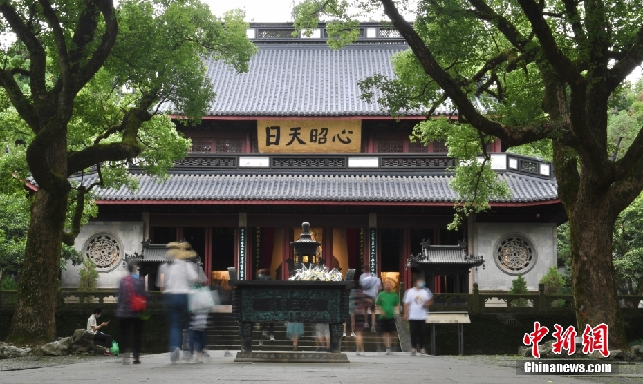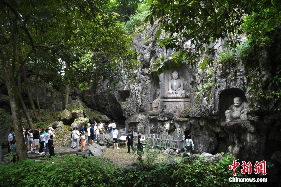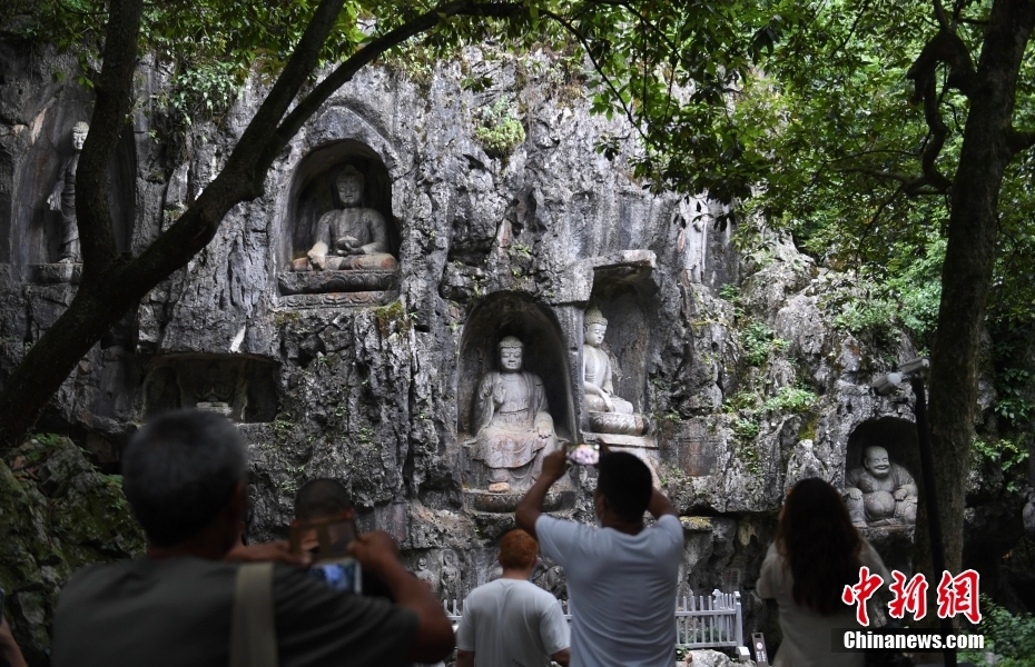 6月24日,游人在飞来峰景区参观佛像石刻。当日,浙江杭州西湖风景名胜区迎来申遗成功11周年纪念日,也是“杭州西湖日”,西湖周边17个收费景点免费对市民和游客开放。中新网
