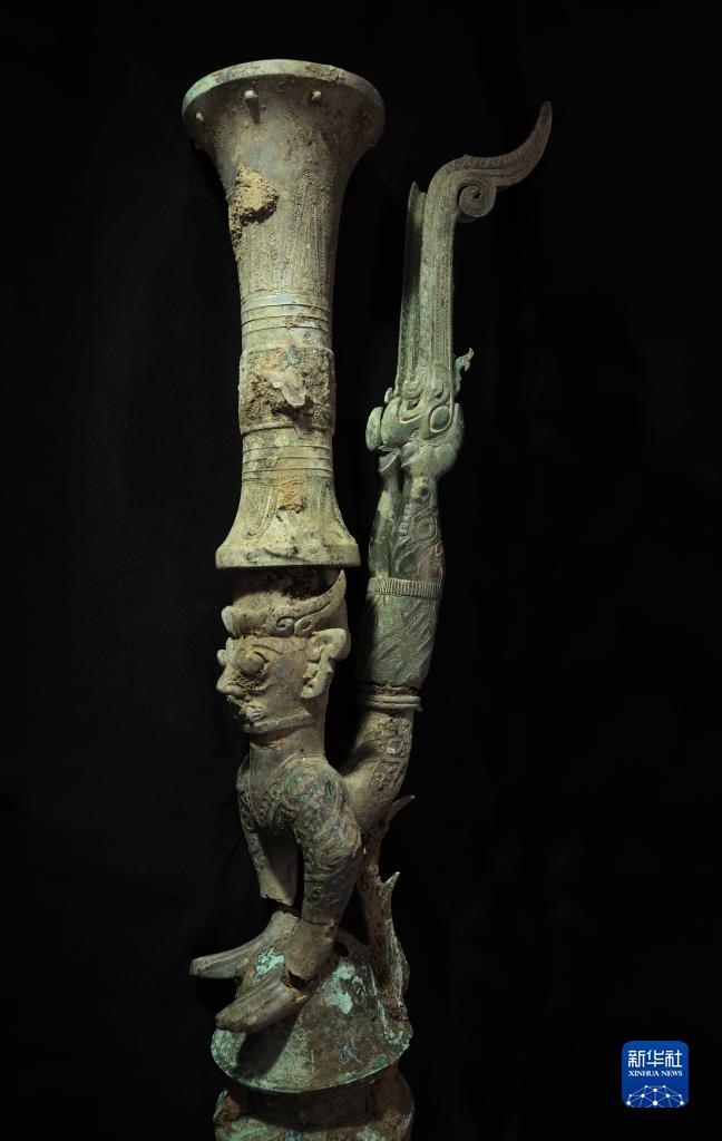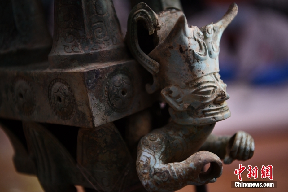 6月29日,四川广汉,三星堆博物馆文保中心副主任郭汉中透露,三星堆8号祭祀坑出土的青铜神兽、青铜神坛和3号祭祀坑出土的被称为“奇奇怪怪”的铜顶坛人像或可拼对。图为青铜神坛局部。中新网