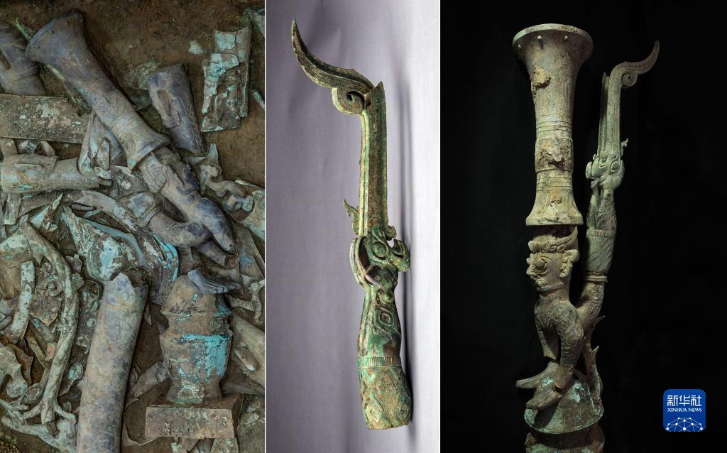 拼版照片:左为6月1日在四川省广汉市拍摄的三星堆遗址8号“祭祀坑”新发现的顶尊蛇身铜人像(新华社记者 沈伯韩 摄);中为6月15日拍摄的1986年2号“祭祀坑”出土的青铜鸟脚人像残部(三星堆博物馆供图);右为6月15日拍摄的拼对成功的鸟足曲身顶尊神像(鲁海子 摄)。新华网