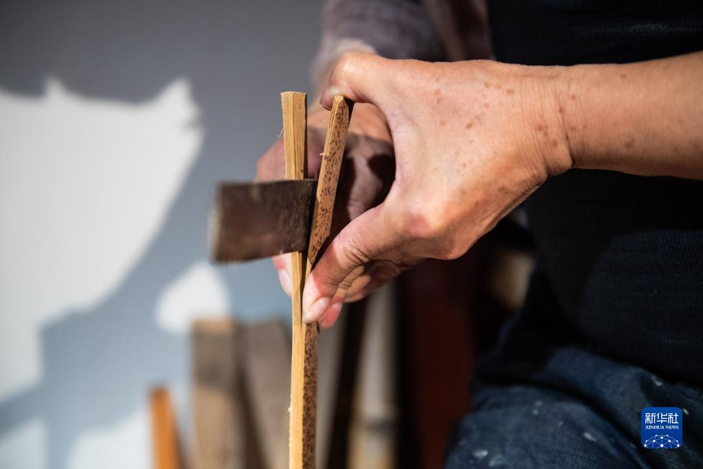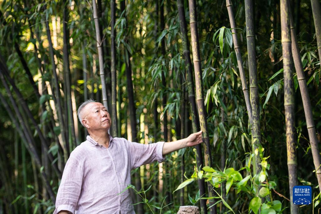 岳州扇是中国三大名扇之一,始于明末清初。岳州扇以湖南本地产的优质竹子为扇骨,牛角为钉,宣纸为面,就制作技艺来说,分扇骨和扇面制作两大程序,包括锯筒、劈片、边骨推青、小骨推青、镶边骨、取边、打磨、钻眼等72道工序。其中,扇骨制作与造型是岳州扇最见技术功力的关键一环,要经过锯、劈、刨、挫、煮等多项工序,用料考究,工艺严谨。岳州扇制作技艺于2021年被列入第五批中国国家级非物质文化遗产扩展项目名录。 今年70岁的刘正文,从事制扇行业已有56年。20世纪70年代,他进入岳阳制扇厂工作。随着风扇、空调的普及,传统制扇行业开始走下坡路,经营了数十年的岳阳制扇厂退出历史舞台。之后,刘正文带着家人和厂里部分员工创办了“巴陵扇社”。在2014年中国扇子艺术节上,刘正文率弟子们制作的高3.3米、纵长5.8米、弧度180度的折扇备受关注。图为6月22日,在岳阳市君山区一处竹林,刘正文查看斑竹长势。