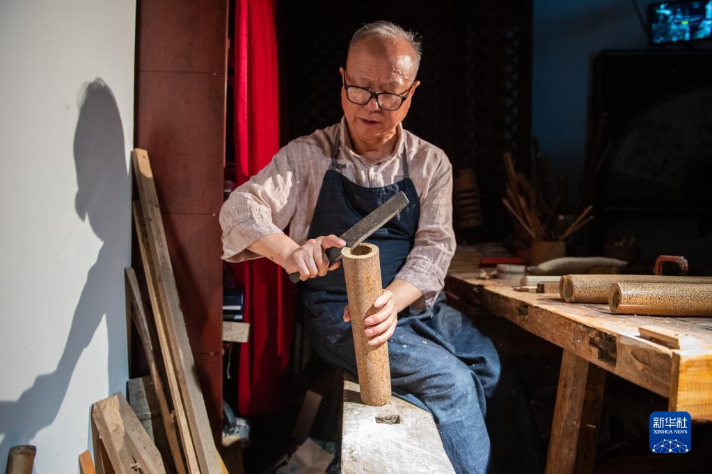 6月23日,在岳阳市巴陵扇社,刘正文在锯筒准备制作扇骨。