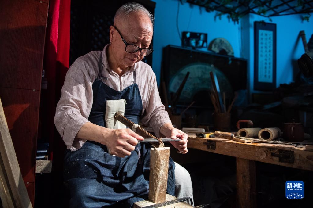 6月23日,在岳阳市巴陵扇社,刘正文在削边骨。