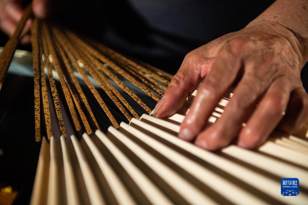 6月23日,在岳阳市巴陵扇社,刘正文把扇骨穿进扇面。