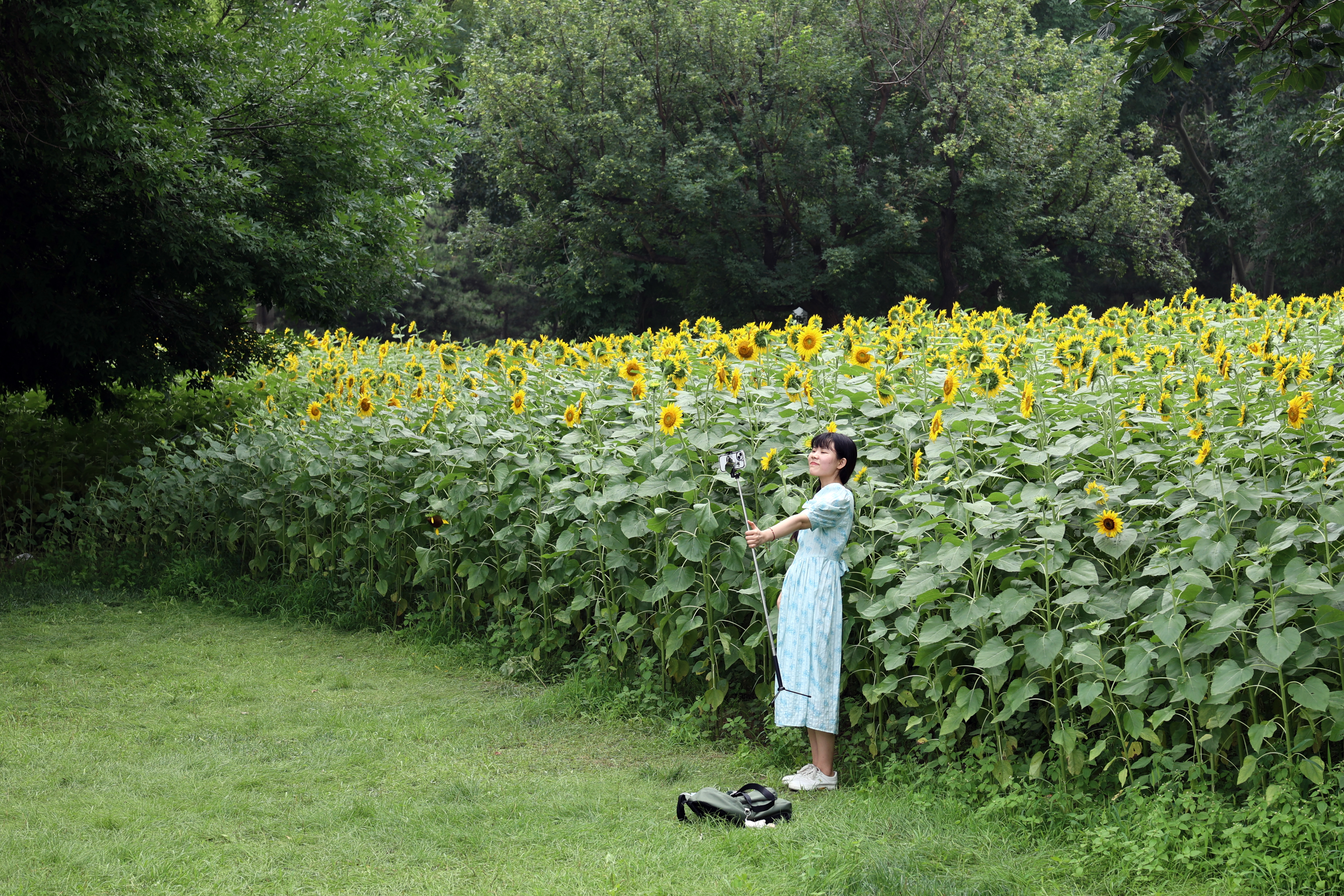 近日,“第十一届奥林匹克森林公园花卉观赏季——百亩葵花展”在北京奥林匹克森林公园北园“花田野趣”景区向游人免费开放。奥林匹克森林公园北园向日葵占地近百亩,分为东、西两块场地,种植着三阳开泰、白月光、金富贵、金拥碧翠等20余个稀有向日葵品种,目前花海已进入盛花期,吸引众多游客前来打卡。图为7月5日,游客在向日葵花田里拍摄。 南美侨报网特约记者李久骏摄