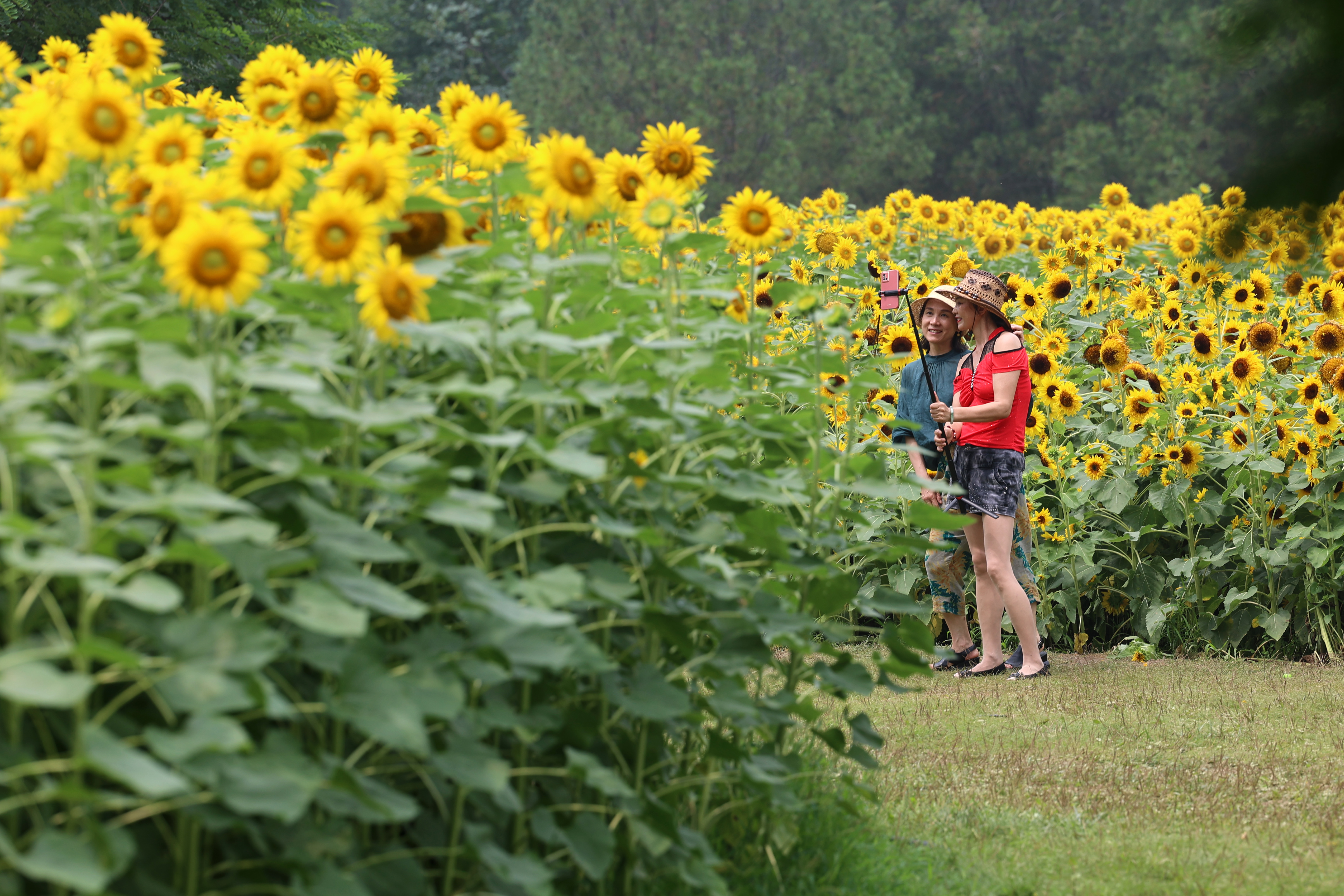 7月5日,游客结伴在向日葵花田里自拍。 南美侨报网特约记者李久骏摄