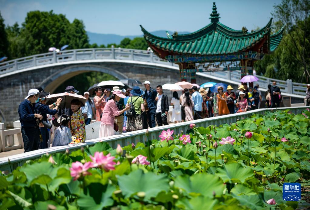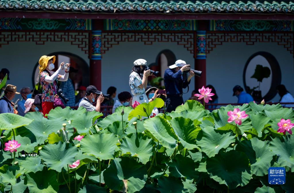 进入7月,中国多地的荷花陆续进入盛花期,在骄阳下竞相绽放,吸引了众多游人前往赏花游玩。绽放的荷花摇曳生姿,暗香浮动,为炎炎夏日增添了一抹亮色和几许诗意。 7月6日,中国第36届全国荷花展览在云南省昆明市大观公园开展。本次荷花展以“合·和·荷”为主题,吸引众多游客前来观光游览。图为7月6日,游客在昆明大观公园欣赏荷花。新华网