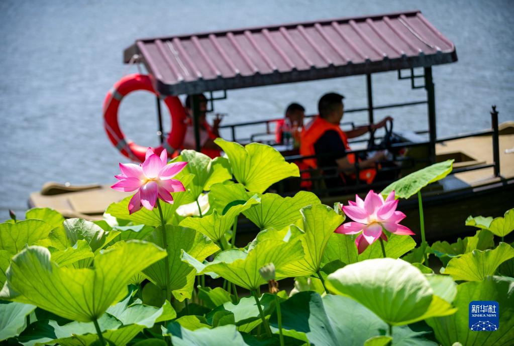 7月6日,载着游客的船从大观公园盛开的荷花旁经过。新华网