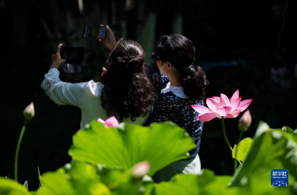 7月6日,游客在大观公园内与盛开的荷花自拍合影。新华网