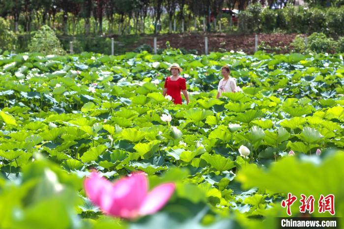 近年来,湖北省襄阳市襄城区坚持全域推进美丽乡村建设,全链条发展乡村文旅产业,促进乡村振兴,逐步实现了“农业强、农民富、农村美”的发展目标。位于襄城城郊的姚庵村借机推出亲子游、种植游、自助采摘游、水库垂钓等项目,发展乡村旅游,助力村民增收致富,先后荣获“全国乡村旅游重点村”“湖北宜居村庄”“湖北省旅游名村”等称号。7月5日,襄阳市襄城区尹集乡姚庵村,400余亩荷花湖的荷花竞相绽放,吸引了众多游人前来赏花游玩。中新网