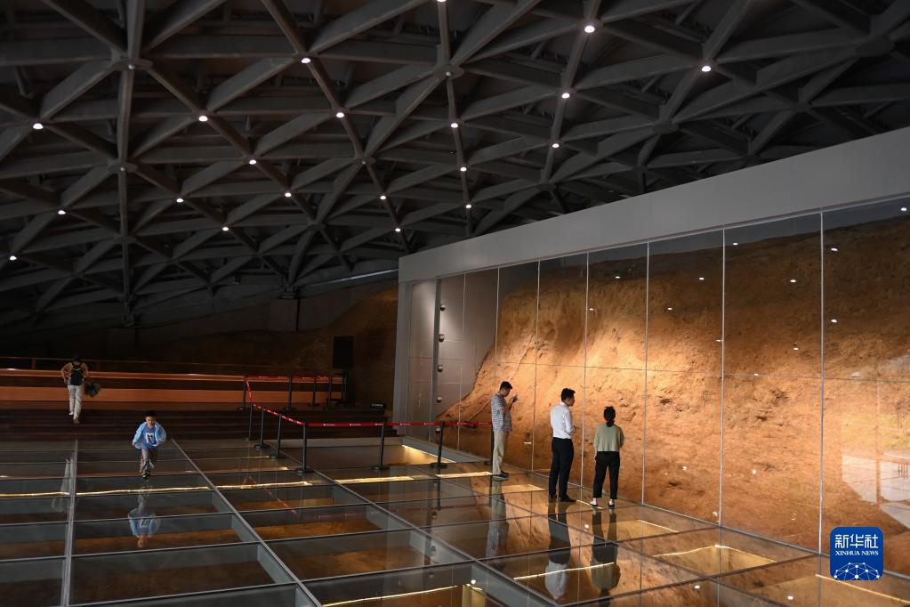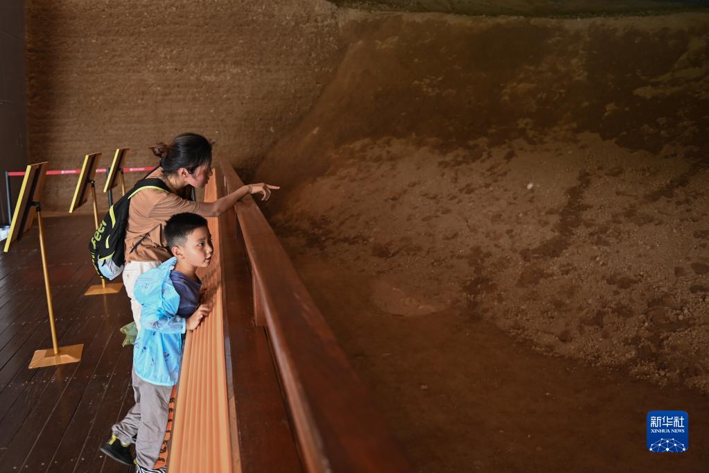 7月6日,一名家长带孩子在老虎岭水坝遗址展示馆内参观沙袋覆土回填保护区。新华网