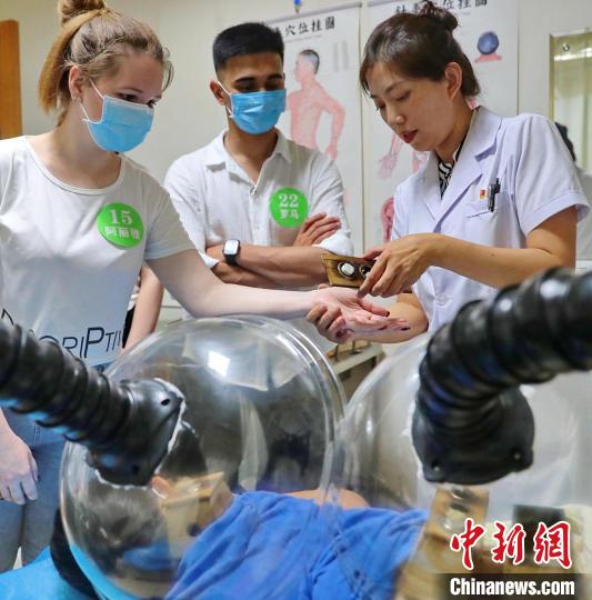 7月7日,由中国教育部国家留学基金委主办,燕山大学、河北省秦皇岛市中医医院承办的“感知中国——让世界认识中医药文化”来华留学生中医药文化体验系列活动拉开帷幕。当日,燕山大学教师带领该校外国留学生走进秦皇岛市中医医院,通过参观中药药房、体验针灸、艾灸等方式,让外国留学生零距离学习中医药知识,感受中医药传统文化。图为医务工作者为燕山大学外国留学生讲解艾灸知识。