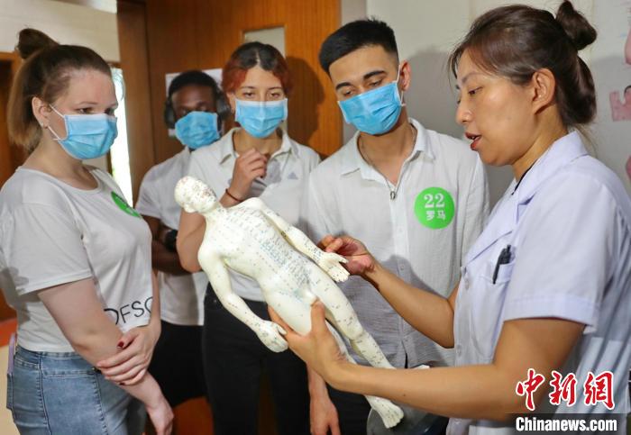 医务工作者为燕山大学外国留学生讲解针灸知识。