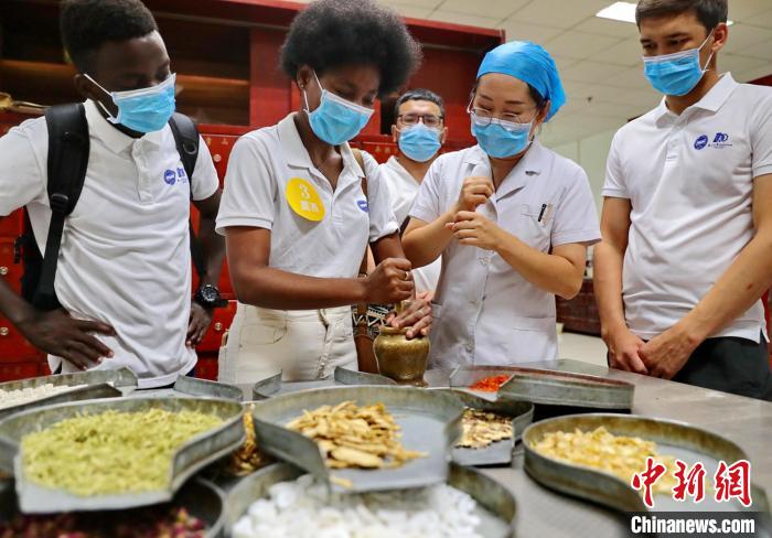 医务工作者指导燕山大学外国留学生学习中药知识。