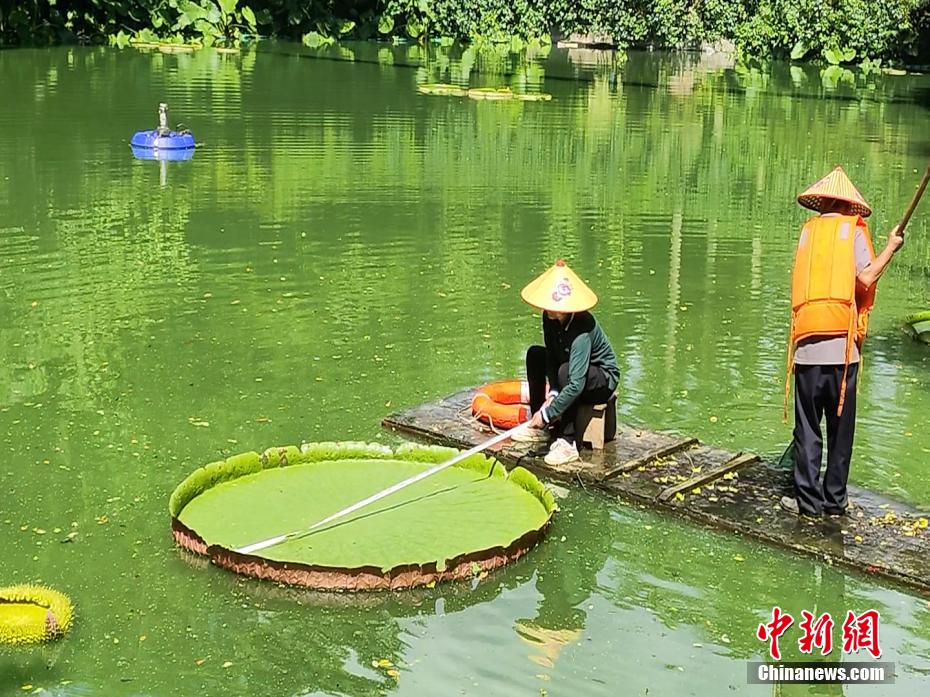 7月13日,广西南宁青秀山风景区一株直径约2.18米、可托重75公斤的巨型王莲登场,吸引市民围观。这是今年以来青秀山最大的王莲。王莲原产于南美洲的亚马孙河流域,是一种典型的热带植物,叶的边缘向上卷曲,犹如一只只浮在水面上的翠绿色大玉盘。王莲特殊的叶脉结构让王莲拥有承重的能力。图为工作人员为巨型王莲“量身”。