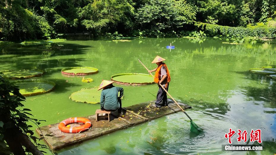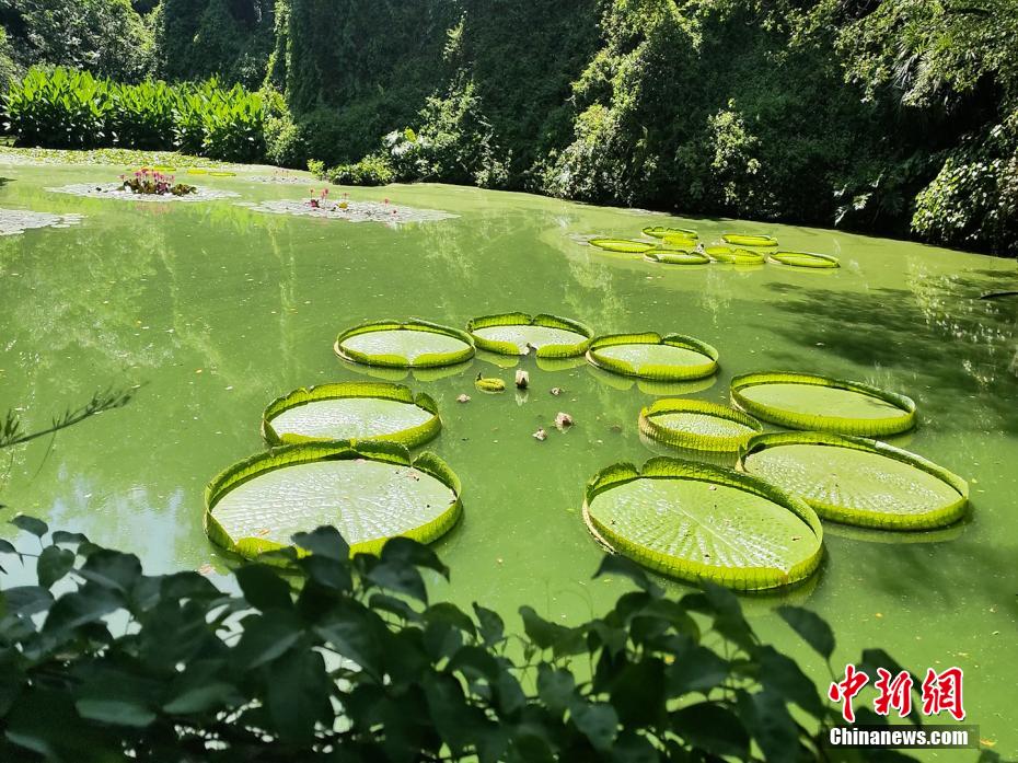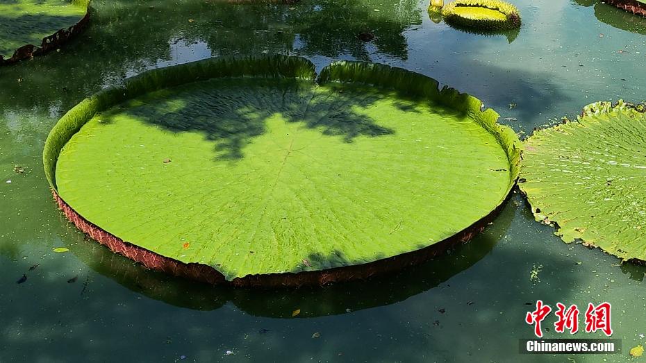 7月13日,广西南宁青秀山风景区一株直径约2.18米、可托重75公斤的巨型王莲登场,吸引市民围观。这是今年以来青秀山最大的王莲。