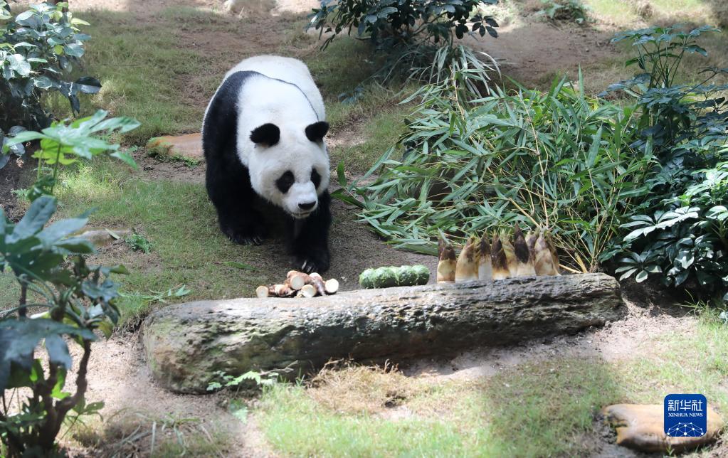 在香港海洋公园,大熊猫“安安”走向美食(2020年5月11日摄)。新华网