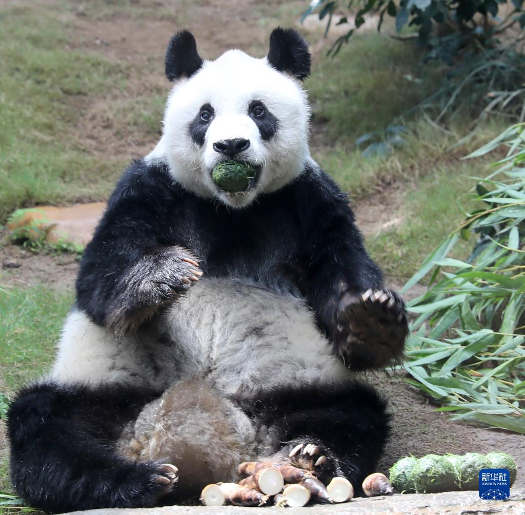 在香港海洋公园,大熊猫“安安”坐在小山坡上吃竹叶团(2020年5月11日摄)。新华网